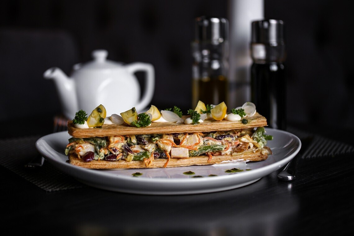 Культовое блюдо из кремлевских рецептов Анатолия Галкина в авторском исполнениии местного шеф-повара: копченая на яблочной щепе утка с капустой в тонком слоеном тесте с фирменным соусом; 360 граммов, 12 рублей