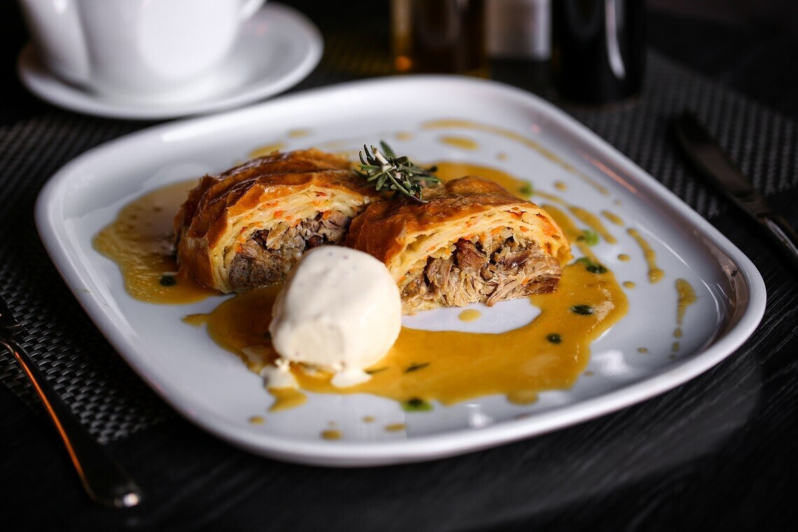 Штрудель с копченой уткой, капустой и горчичным мороженым