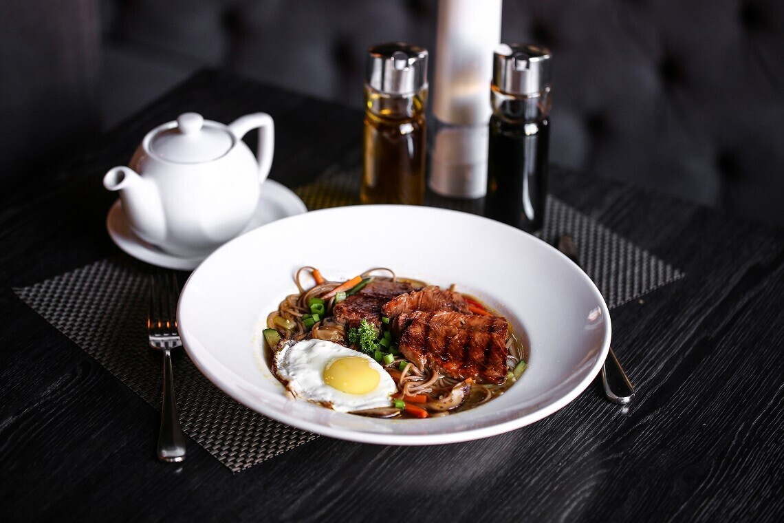 Гречневая лапша соба в бульоне с овощами и говядиной в соусе Хойсин; 400 граммов, 15 рублей