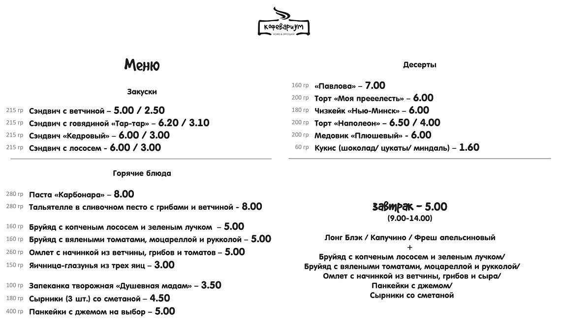 В меню нестандартной столичной кофейни «Кофевариум» можно найти и закуски, и горячие блюда, но среди минчан она славна домашними десертами: их готовят на собственном производстве прямо в местной кухне. Смотрите, что и по какой цене здесь удастся попробовать.