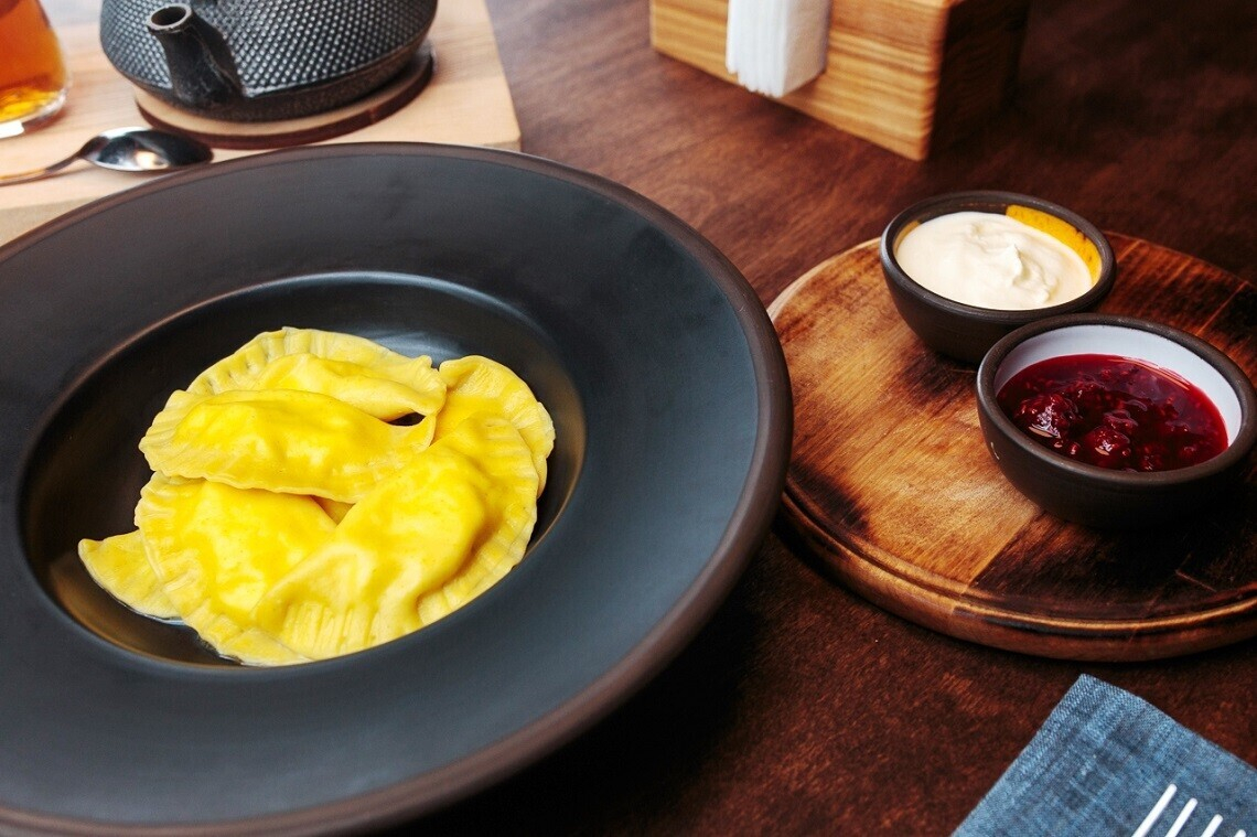 Вареники с творогом и малиновым соусом