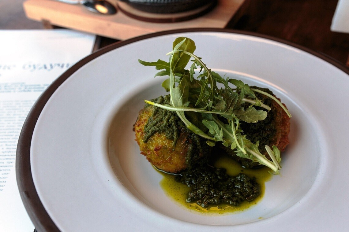 Аранчини с креветками, сыром Маскарпоне и соусом из садовых трав