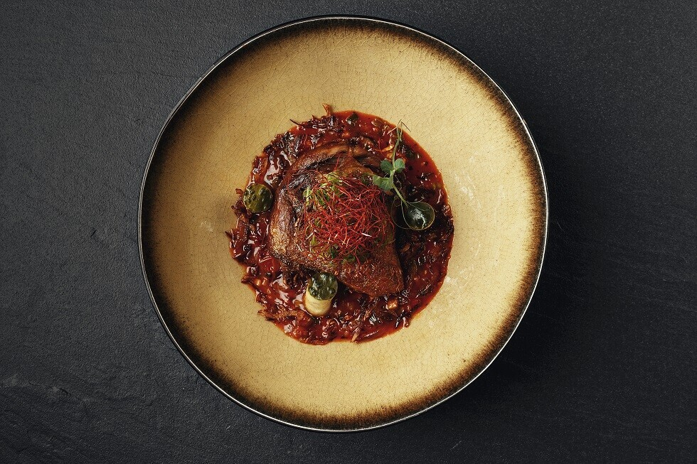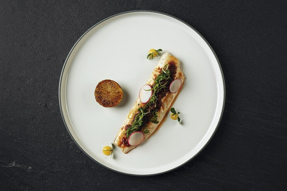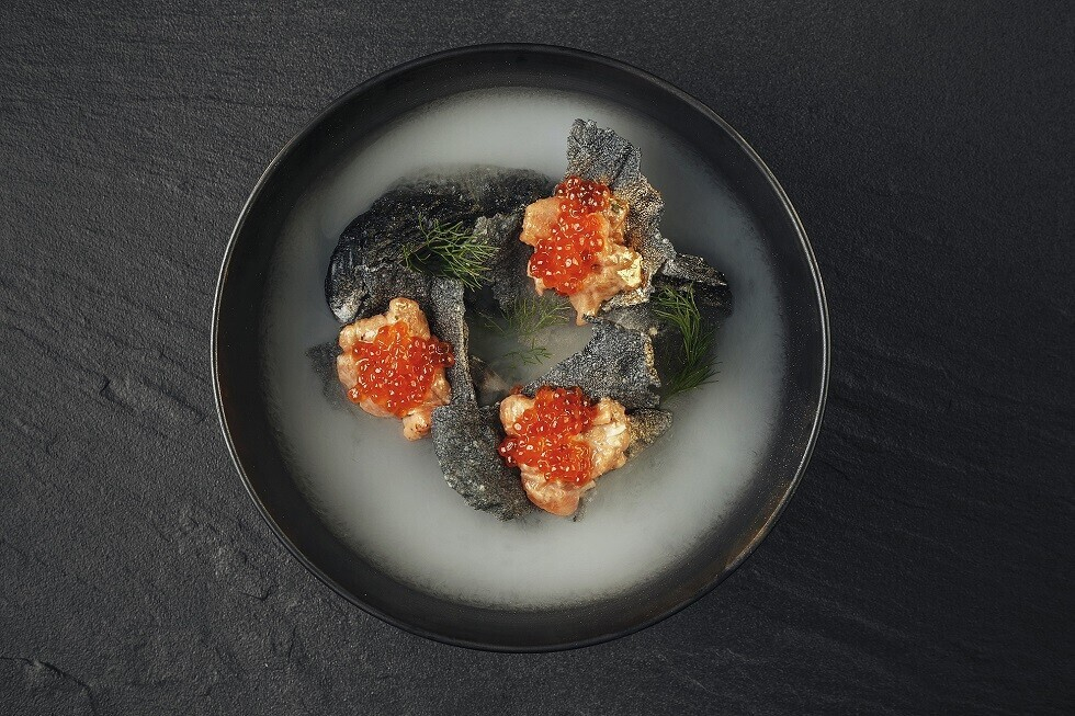 Целый раздел нового меню посвящен DOT-снекам — миниатюрным закускам для аперитива, которыми удобно делиться друг с другом. Шеф рекомендует начать с тартара из лосося, который он маринует в цитрусовом соусе понзу и подает в майонезе из васаби с красной икрой. Особого внимания заслуживает презентация — блюдо подают в апельсиновой дымке.