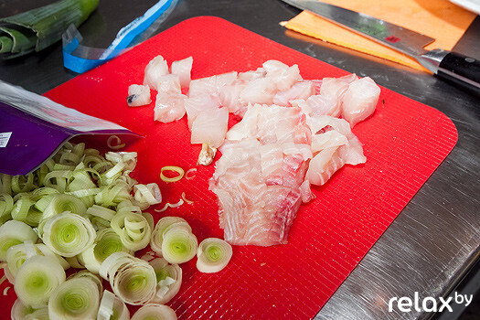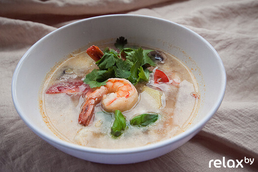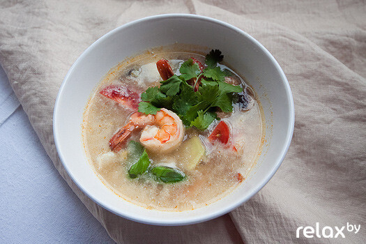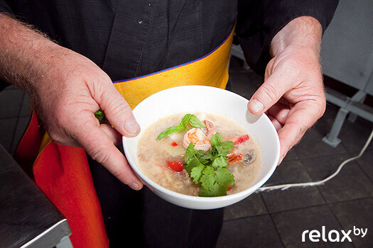 В японский суп Том Ям Кунг Николай добавил более 20 (!) ингредиентов: кальмары, креветки, морской коктейль, свежий имбирь, чили паста, базилик, сок лайма, устричный соус, шампиньоны, кокосовое молоко…. К слову, последнее шеф-повар не рекомендует заменять коровьим: то, что хорошо японцу, плохо белорусу! Не только для нашего сознания, но и для организма молоко и морепродукты – вещи несопоставимые.