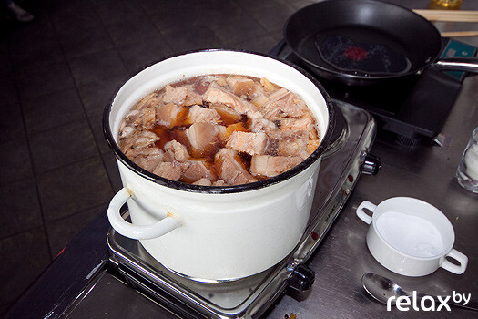Отправляясь в Беларусь, Николай долго думал, что бы приготовить такое, чтобы и намек на наши кулинарные вкусы был, и японские кулинарные традиции проявились. В результате гости мастер-класса попробовали свинину Бута Но Каку Ни. Отзывы были лаконичны – «Бесподобно!». Секрет, как отмечает шеф-повар, в томлении мяса: «Несмотря на то, что я представляю блюда японской кухни, старя добрая русская печь, как ностальгия по уходящему, мне неизменна дорога! Раньше мясо клали в горячую печь и оставляли томиться. В результате сохранялся сок, появлялась невероятная нежность мяса. Советую мастерам кухни взять этот проверенный веками метод на вооружение!».
