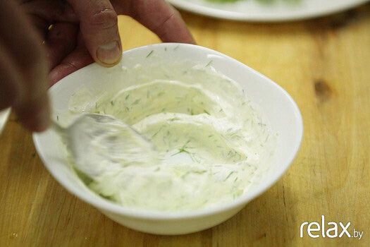 6. Готовим соус: смешиваем сыр Фетаки со сливками, нарезаем туда мелко укроп, выдавливаем сок половинки лимона и разминаем ложкой. Соус подается отдельно, чтобы его каждый мог положить на свой вкус.