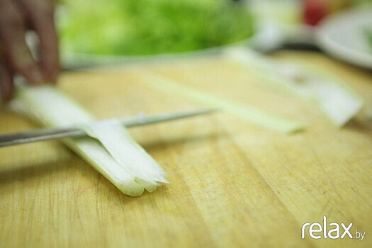 3. Режем сельдерей вдоль стебля на тонкие пластинки.