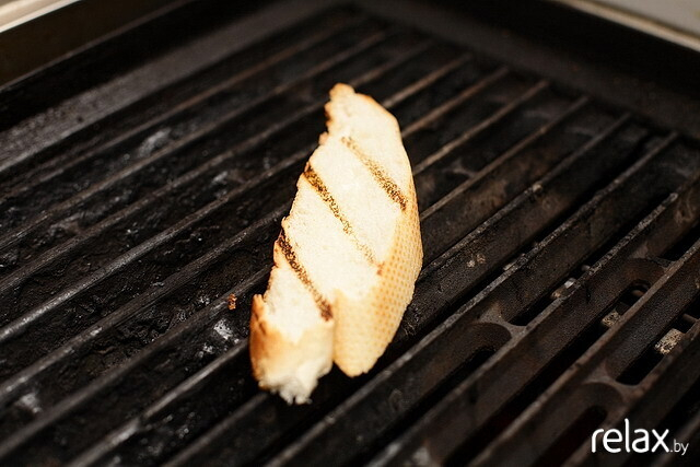 3. Доводим филе индейки до готовности ― кладем его в печь (180° C) на 10-15 минут, в зависимости от толщины. Пока индейка допекается, обжариваем на гриле багет и помидоры черри.