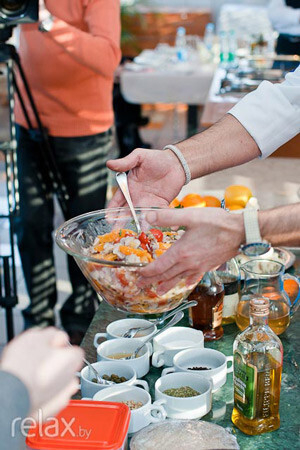 Салат из апельсинов, сельди и лука Тропеи с помидорами черри ресторана «Поющие фонтаны»