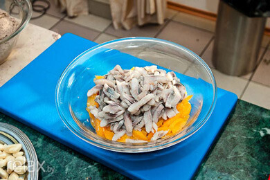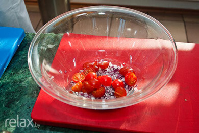 Салат из апельсинов, сельди и лука Тропеи с помидорами черри
