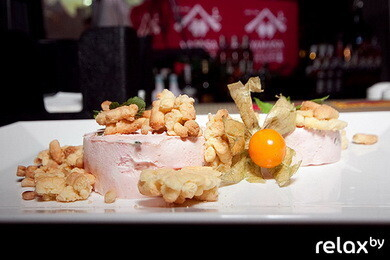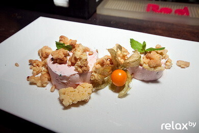— сыр «Cremette» перемешиваем с рубленой мятой, с натертым на мелко терке корнем имбиря и сиропом «Гренадин»;