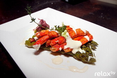 Особенность блюда: контрасты ароматов! Нейтральная спаржа, великолепно пахнущий краб и нежность сыра отлично дополняют друг друга. Однако подобное блюдо является вопросом цены: хороший свежий краб не только в Минске стоит дорого.