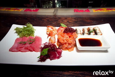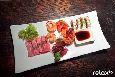 Подача: рыбное ассорти подаем с васаби, имбирем и соевым соусом.