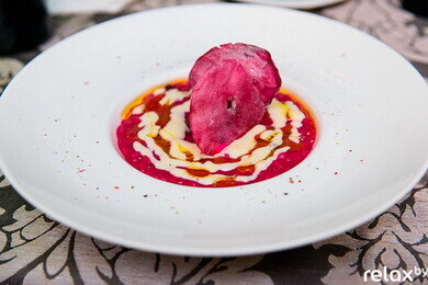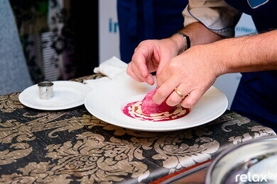 Завершающий этап — подача ризотто. Тартар из свеклы Марко выкладывает в центр, используя кулинарное кольцо. Вокруг — фондю из сыра «Кастельманьо» и немного редукции из курицы. Шеф-повар использует глубокую тарелку: так блюдо остается горячим и выглядит элегантно.