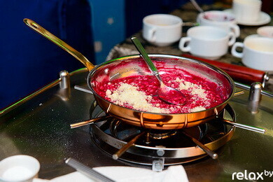 Второй этап — приготовление свеклы. Половину Марко взбивает, а из второй половины делает тартар. Свекла придает ризотто не только удивительную нотку вкуса и цвет, но и особый аромат.