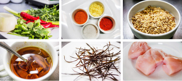 05. В ореховый соус добавляем куриный бульон, затем поливаем маслом из шафрана. Готовить последнее просто: полученное ореховое масло обжариваем с луком и добавляем шафран.