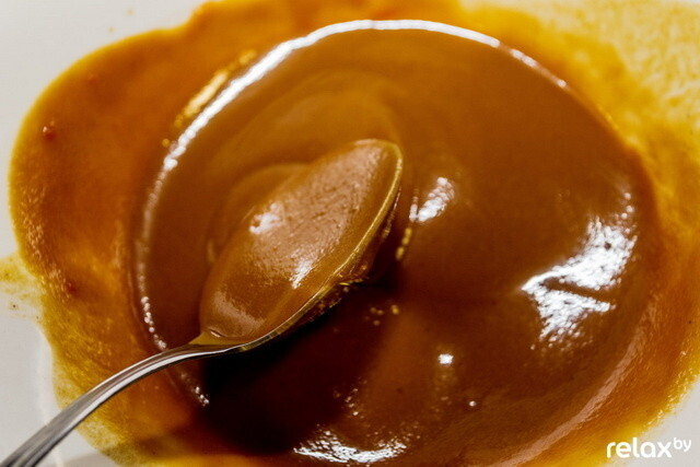 Горчицу смешиваем с небольшим количеством коньяка и пряной смесью табаско. Если готовите дома, то последнюю лучше купить в готовом виде. Завершающие ингредиенты — соевый и томатный соус.