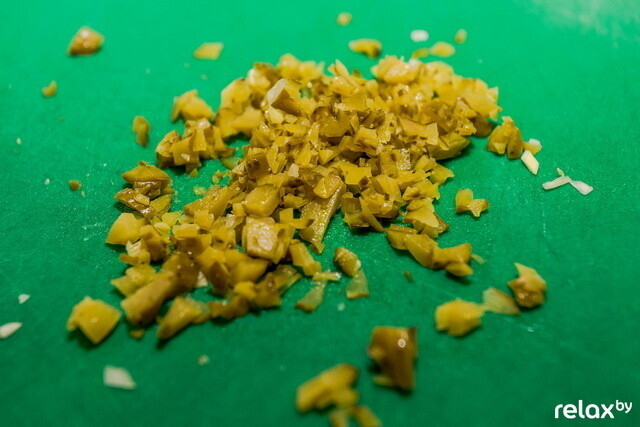 02 Далее — заправка. Шеф-повар добавляет предварительно измельченные лук порей, каперсы, маринованные огурчики, а также смесь пяти перцев и немного оливкового масла. Станислав рассказывает: