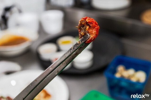 В целом тартар готов, но блюдо еще нужно правильно подать. Его декор, как отмечает Станислав, момент не менее важный, чем сам процесс приготовления. На тарелку выкладываются вяленые томаты черри. Готовят их в ресторане самостоятельно: около 8–9 часов помидоры томятся при температуре 80 градусов. «В таких томатах абсолютно другой вкус, нежели в покупных. Да и консервантов нет», — замечает шеф.