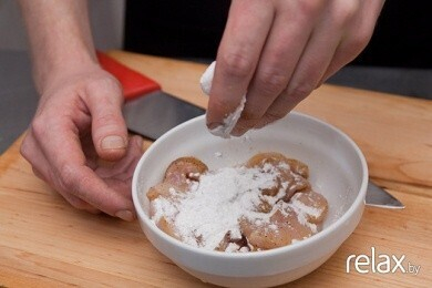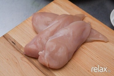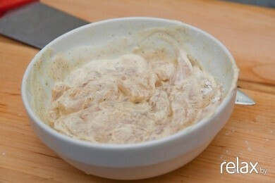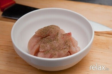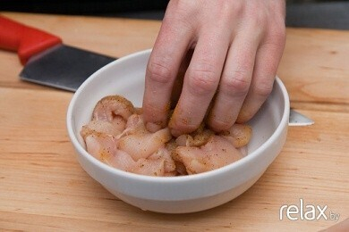 2. Добавить к куриному филе соль, перец и карри. Затем тщательно перемешать.