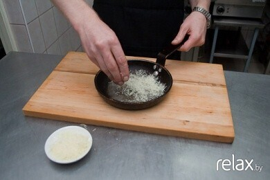 5. Высыпать пармезан на подготовленную сковороду и обжаривать его на огне в течение 1,5 минут до расплавленного состояния.