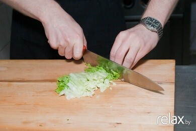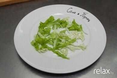 12. Оформить тарелку. Для этого нарезать листья салата соломкой, перемешать их и выложить на посуду.