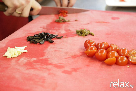 2. Нарезаем помидоры черри пополам, чеснок ломтиками, маслины продолговато, слегка нарезам каперсы, мельчим анчоусы, чуть-чуть Чили перца.