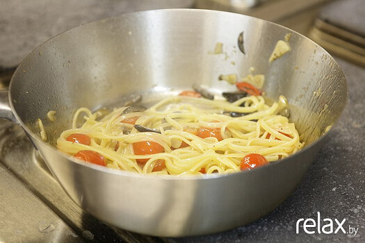 3. Под конец варки лингвини быстро обжариваем (2-3 минуты) нарезанные ингредиенты. Сначала выкладываем на сковороду с подогретым оливковым маслом чеснок, потом анчоусы, перец Чили, потом всё оставшееся. Посолить, поперчить.