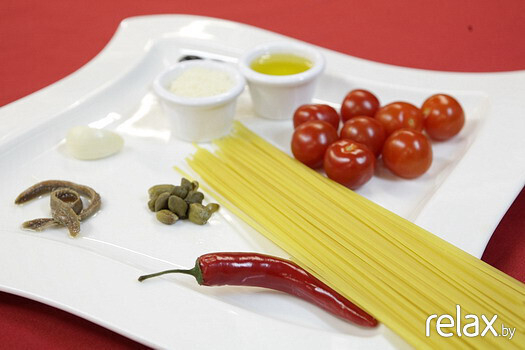 Лапша с любовью приправленная быстро обжаренными томатами черри, острым перцем, маслинами, каперсами и анчоусами - настоящий деликатес.