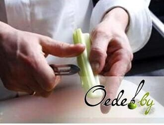 4. Морковь, лук, сельдерей нарезаем и тоже кладем в маринад. Чтобы сельдерей не хрустел на зубах, вырезаем самую серединку, избавляясь от плотных нитей на внешней стороне.