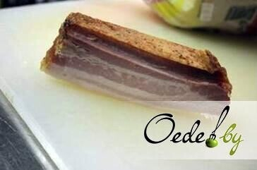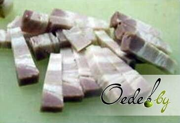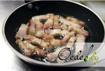 9. Нарезаем грудинку и обжариваем на растительном масле около 3 минут.