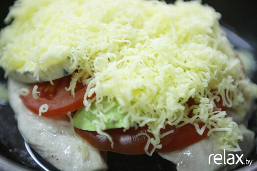 7. Выкладываем на обжаренную курицу овощи слоями: помидор, авокадо, сыр.