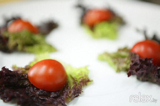 11. Для украшения раскладываем на тарелке салат, на каждый лист кладем по половинке Чери.