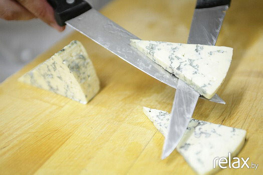 4. Нарезаем сыр с голубой плесенью пластинками.