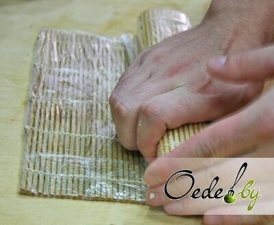 5. Коврик для формирования роллов обтягиваем слюдой. Так он станет более скользким. Слегка растягиваем его и расстилаем на поверхности стола.