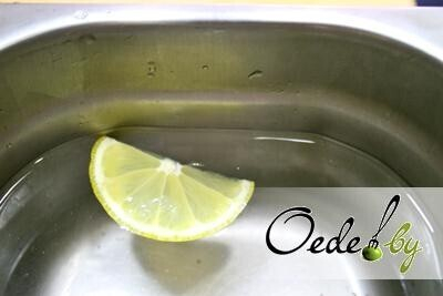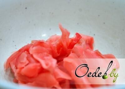 6. Для того чтобы рис не прилипал к рукам, необходимо их периодически смачивать водой. В тарелку с водой добавляем несколько долек лимона и немного имбирного маринада, обладающего антисептическими свойствами.