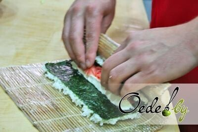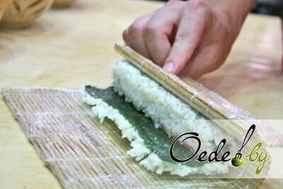 9. «Йоджи Маки» — это роллы, в которых рис располагается снаружи, поэтому аккуратно и быстро переворачиваем комбинацию рис/«Нори».