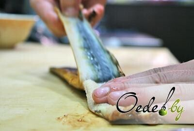 3. Подсушиваем угорь салфеткой, чтобы убрать соус, в котором, как правило продается копченный угорь. Медленно снимаем кожицу, не повреждая структуру угря. Хвост не обрезаем, лишь подравниваем противоположный край.