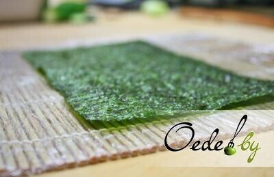 7. Листик водорослей «Нори» берем сухими руками, отламываем половину, поскольку нам понадобится только ½ часть. Помещаем ее на коврик.