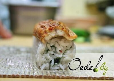 15. При помощи коврика фиксируем угорь. Поливаем угорь соусом «Унаги», он также продается в суши-секциях крупных торговых объектов.