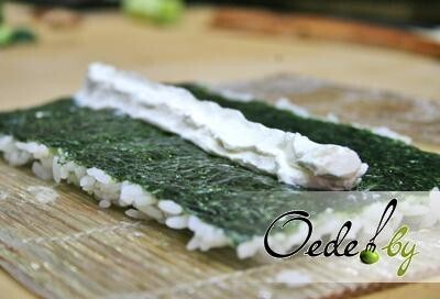 10. Сыр «Филадельфия» размещаем в центре так, чтобы до краев «Нори» оставалось некоторое расстояние, примерно в сантиметр. Его можно заменить любым мягким солоноватым сыром, например «Крем Бонжур».
