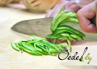 2. Тщательно моем огурцы и нарезаем их тонкой соломкой. Есть небольшой секрет в том, какую именно часть огурца необходимо нарезать. В Японии не принято есть серединку, поэтому мы поступим так же: нарежем соломкой лишь верхнюю часть вместе с кожурой.
