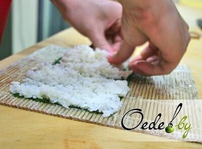 8. Смоченными руками распределяем рис по поверхности «Нори». Размещать рис нужно легкими движениями, не перемещая его, а выкладывая от центра к краю. При этом важно помнить, что рис должен слегка выступать за края «Нори».