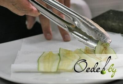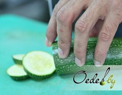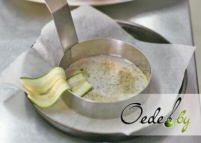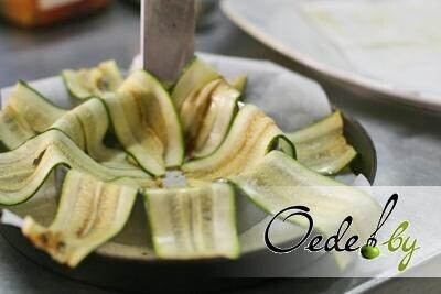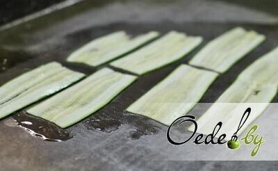 5. Нарезаем цукини тонкими пластинами. Обжариваем их слегка и выкладываем на салфетку, чтобы удалить остатки масла.