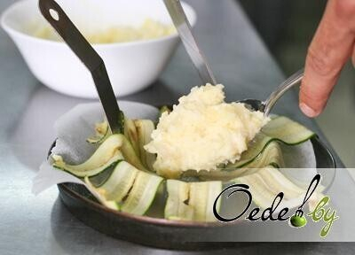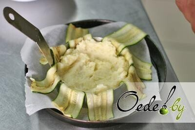 8. Выкладываем на цукини 1-й слой картофельного пюре.