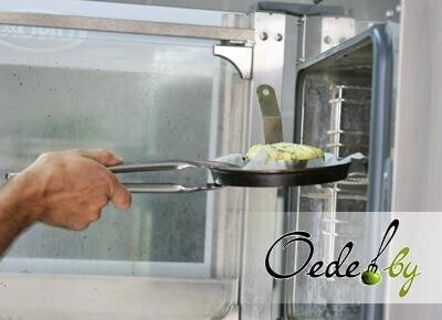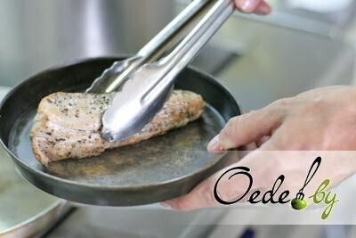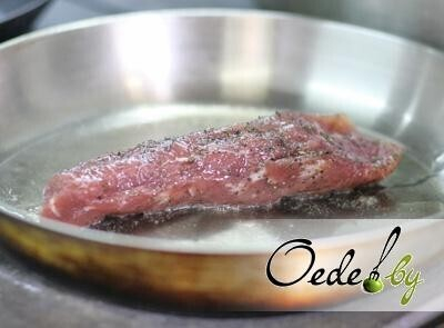 2. Промаринованное мясо выкладываем на раскаленную сковородку с растительным маслом. Обжариваем его со всех сторон («запечатываем»), а затем помещаем в сковороду для запекания и даем мясу «отдохнуть» вне духовки.