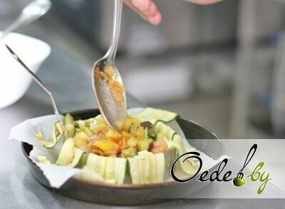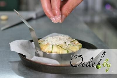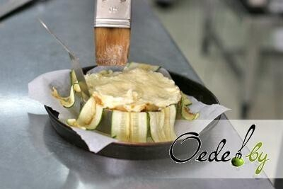 7. Слегка смазываем растительным маслом бумагу для выпечки. Размещаем на ней форму для запекания и устилаем и обжаренными пластинами цукини.