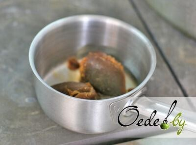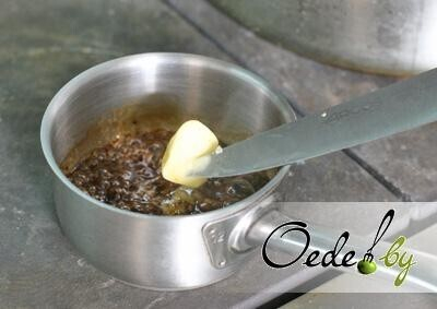11. В это время готовим соус. Растапливаем заготовку «Деми-гляс», добавляем сливочное масло и французскую горчицу. Доводим полученную массу до кипения и снимаем с огня. Можно также воспользоваться и обычным соевым соусом.