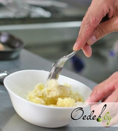 6. Начинаем готовить основу пирога. Картофельное пюре смешиваем со сливками и щепоткой пармезана и мешаем до получения однородной клейкой массы.