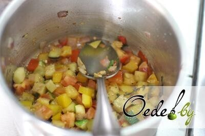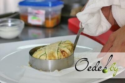 9. Затем следуют тушеные овощи и второй слой картофельного пюре, которое смазываем взбитым яйцом и закрываем кончиками цукини.